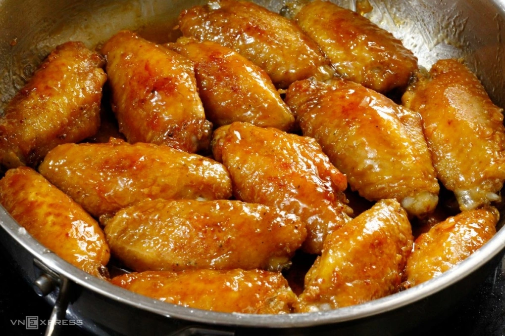 Cánh gà vàng ruộm, phủ lớp sốt mắm óng ả. Khi ăn, thịt bên trong mềm ngọt, vị mặn ngọt đậm đà. Món này nhâm nhi hay làm món chính trong các bữa tiệc đều rất ngon.