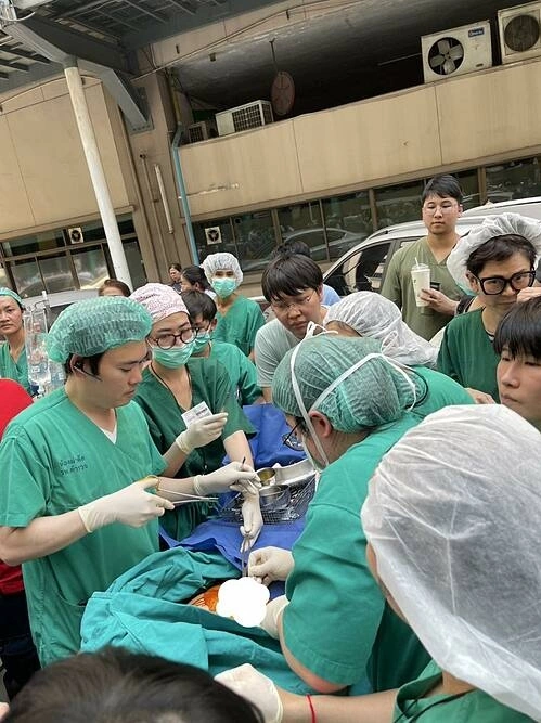 Bác sĩ Waranyu Jiramrit đang khâu đóng vết mổ cho bệnh nhân thì bất ngờ xảy ra rung chấn động đất, êkíp lập tức đưa người bệnh ra ngoài trời và tiếp tục ca phẫu thuật.